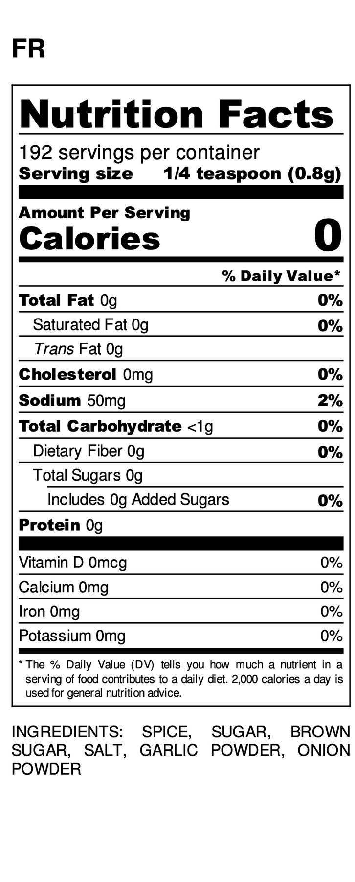 Ingredients:  sugar, brown sugar, salt, garlic, paprika, spices, capsicums, onion, & silicon dioxide (anti-caking agent)