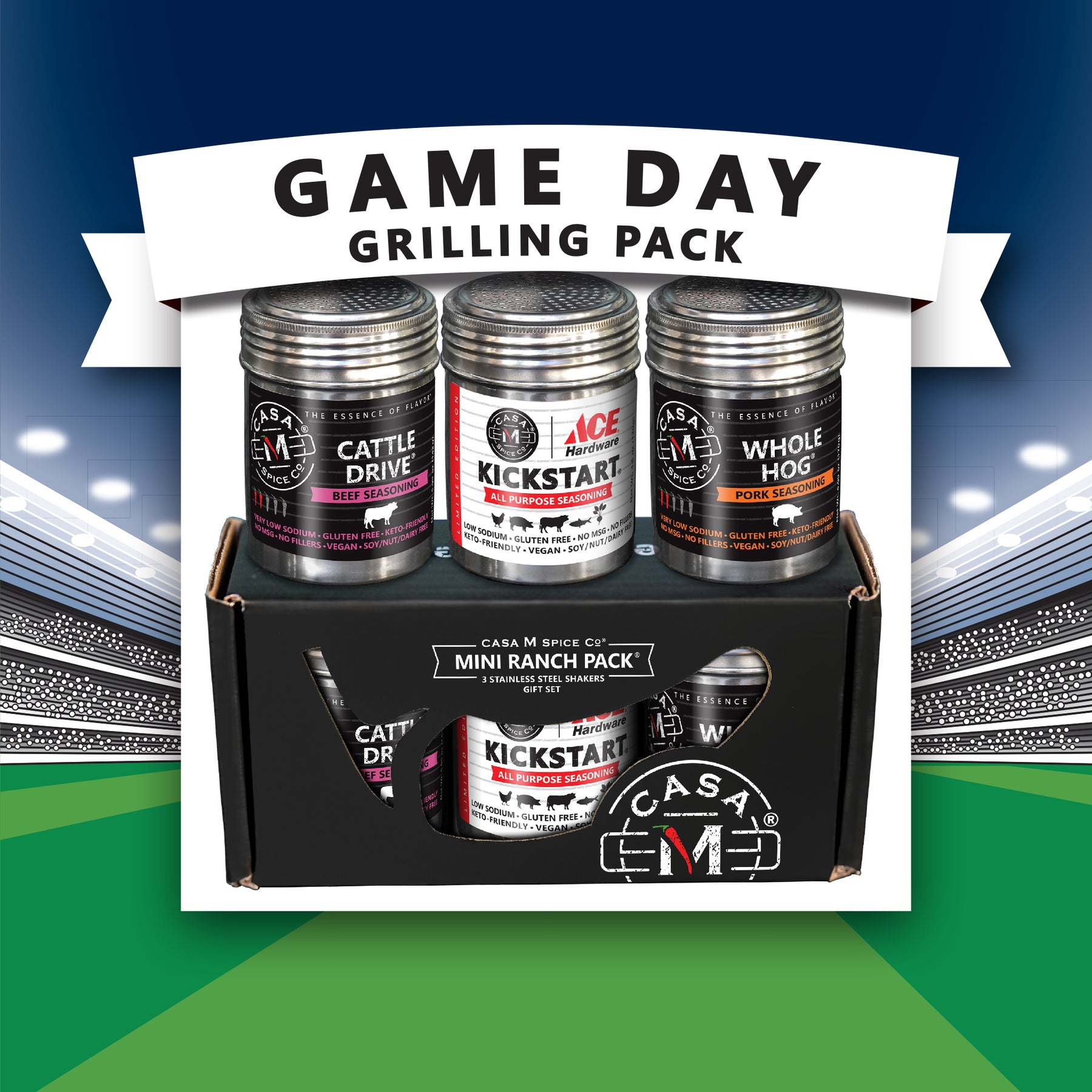 The Game Day Grilling Pack™ comes in our rugged shipper box that is equally stylish and handsome, perfect for gift-giving. Also included are 3 silicone stretch and seal covers that fit tightly over the stainless steel shakers to keep the spices fresh and safe from moisture.