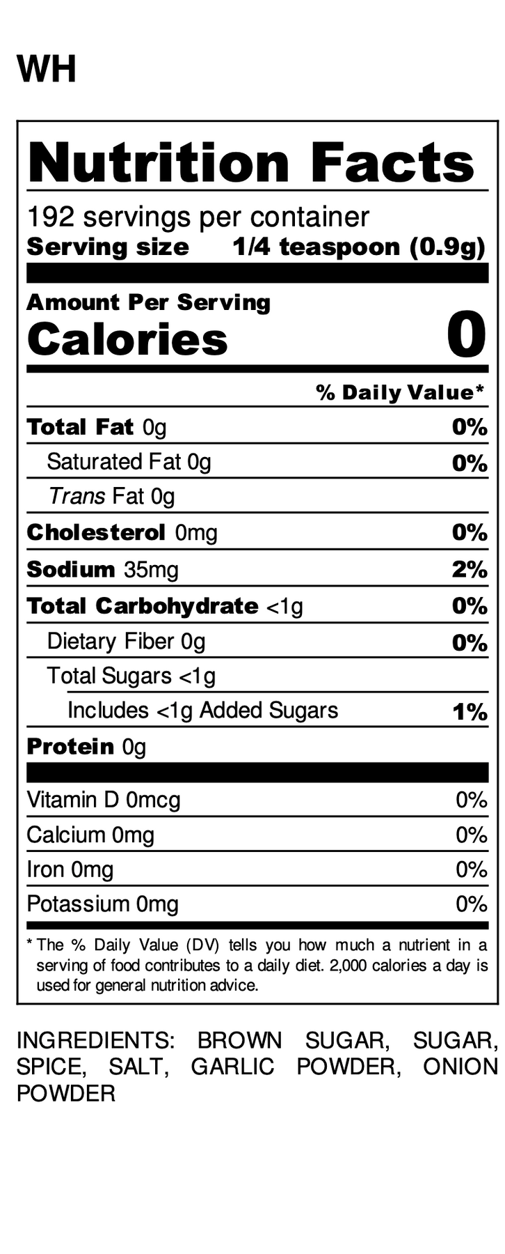 Ingredients: brown sugar, sugar, salt, garlic, paprika, spices, capsicums, ginger, onion, & silicon dioxide (anti-caking agent)