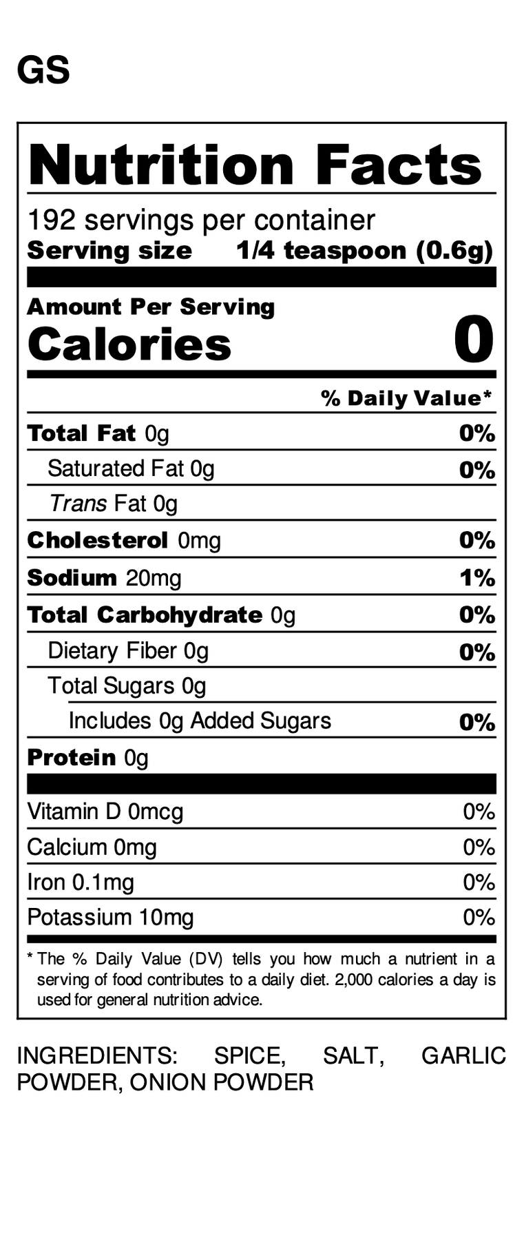 Ingredients: spices, salt, paprika, garlic, capsicums, onion, & silicon dioxide (anti-caking agent)